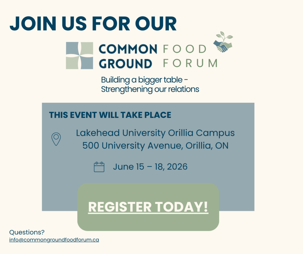 Registration is now open for the Common Ground Food Forum, June 15th-18th 2026 at Lakehead University in Orillia, Ontario, with early bird pricing in effect until May 1st, 2026. Information on accommodation options is also now available.